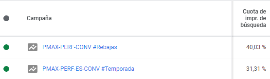 Es interesante, por ejemplo, comparar si tenemos una campaña de máximo rendimiento y una de búsqueda que cuota de impresiones está teniendo cada una.