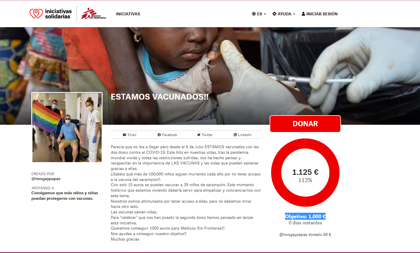 Con esta campaña se buscaba dar a conocer a Médicos Sin Fronteras, y recaudar fondos para el proyecto de vacunación en España. Esto a través de la creación de Iniciativas Solidarias que serían como “retos” que ellos iban a hacer si llegaban a la meta.